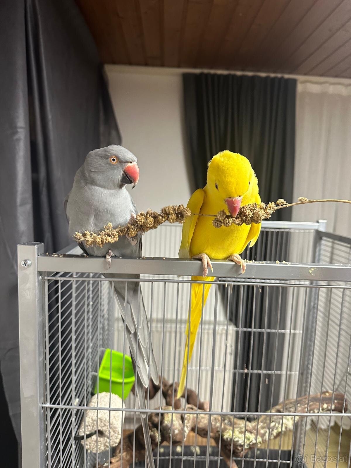 Halsbandsittiche Zuchtpaar – Gelb/Grau – mit Käfig, Zu